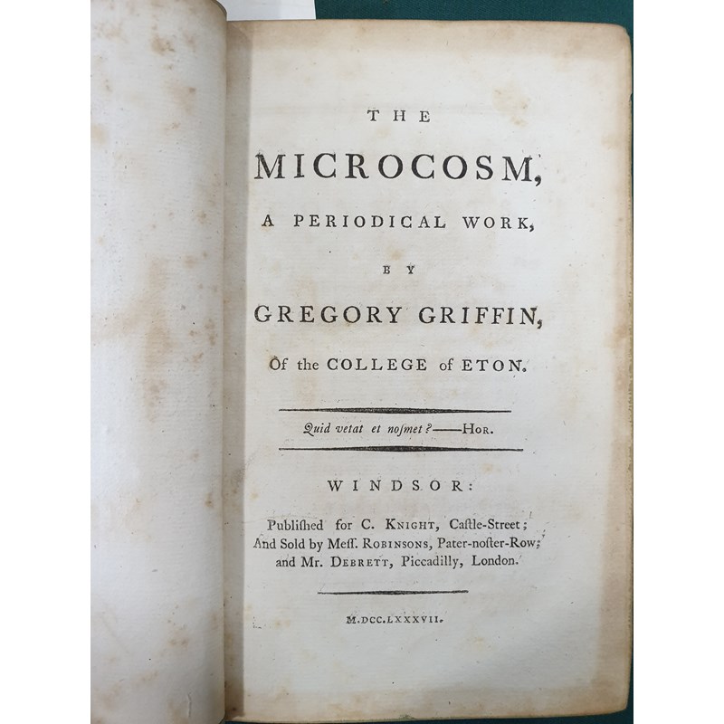 [Canning, George, et al.] The Microcosm, a periodical work, by Gregory Griffin, Of the College of Eton, first edition in book form, nos.1-40, engraved additional title, light spotting, contemporary calf, joints cracked, 8vo, Windsor: C. Knight, 1787