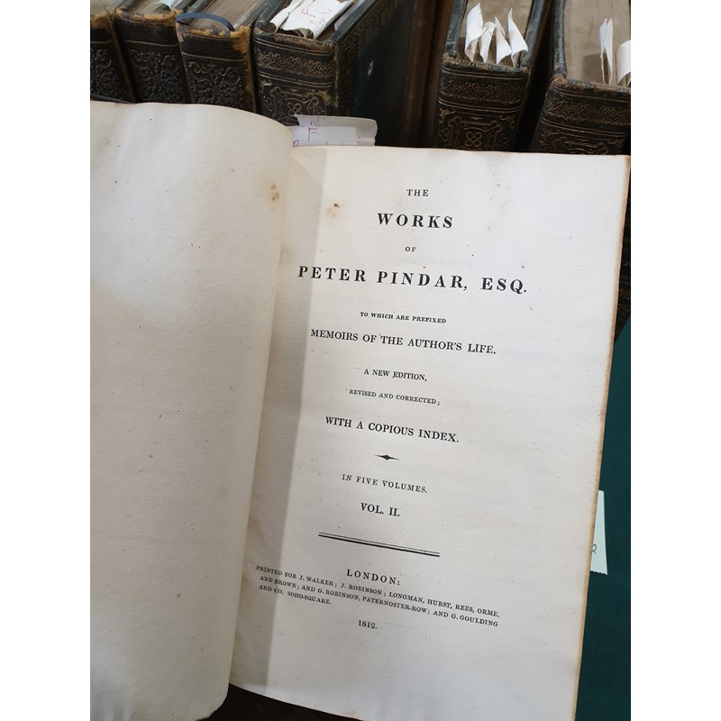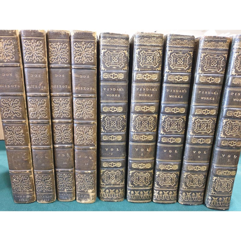 Cervantes Saavedra, Miguel de. The Life and Exploits of the Ingenious Gentleman Don Quixote de la Mancha, 4 volumes, folding engraved map, engraved plates, light spotting, contemporary green straight-grained morocco, tooled elaborately gilt, all edges gilt, 8vo, London: William Miller, 1810; Pindar, Peter. The Works, 5 volumes, engraved portrait frontispiece, contemporary green straight-grained morocco, tooled elaborately gilt, all edges gilt, 8vo, London: J. Walker et al., 1812 (9)