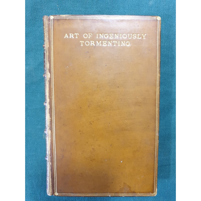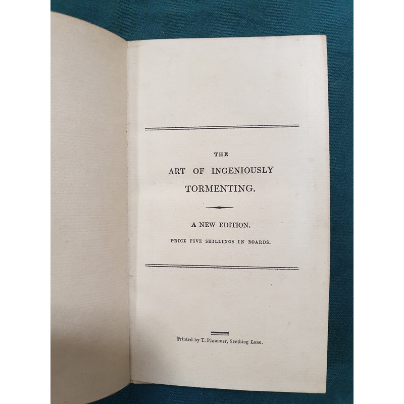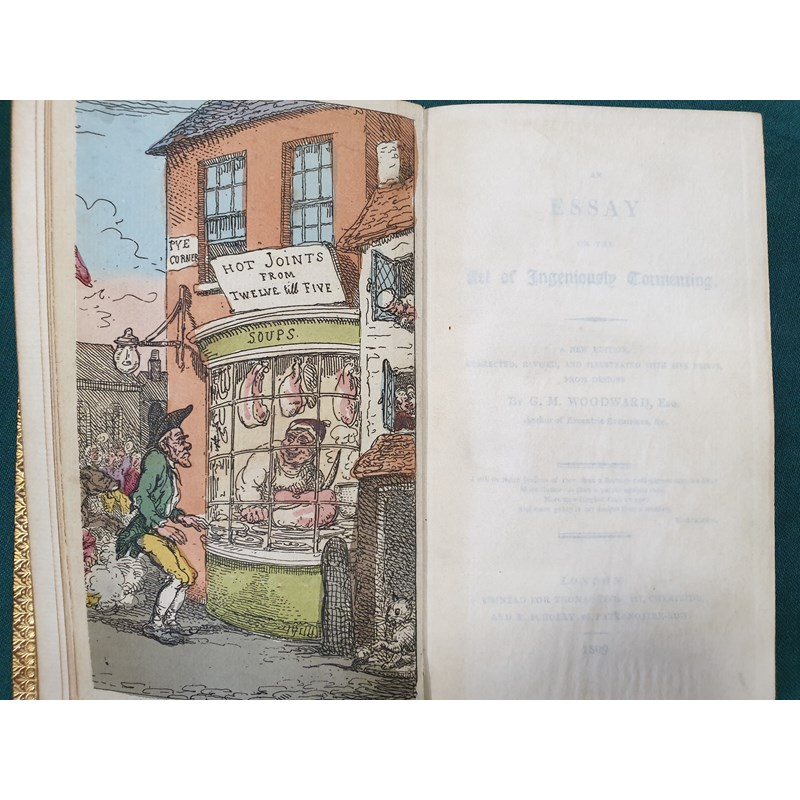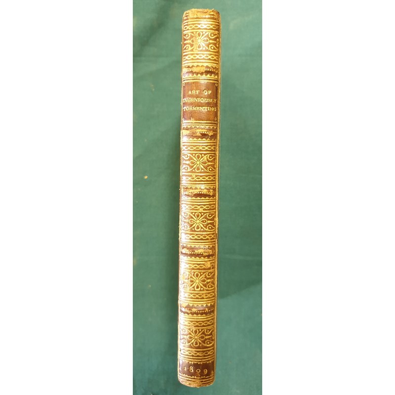 Collier, Jane. An Essay on the Art of Ingeniously Tormenting, new edition, half-title, folding engraved frontispiece and 4 engraved plates after G.M. Woodward, all hand-coloured, some browning, nineteenth century full calf gilt by Sangorski and Sutcliffe, all edges gilt, 12mo, London: Thomas Tegg, 1809