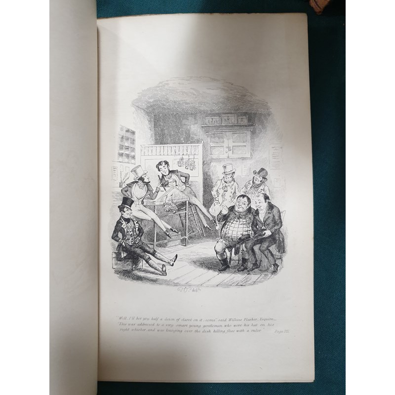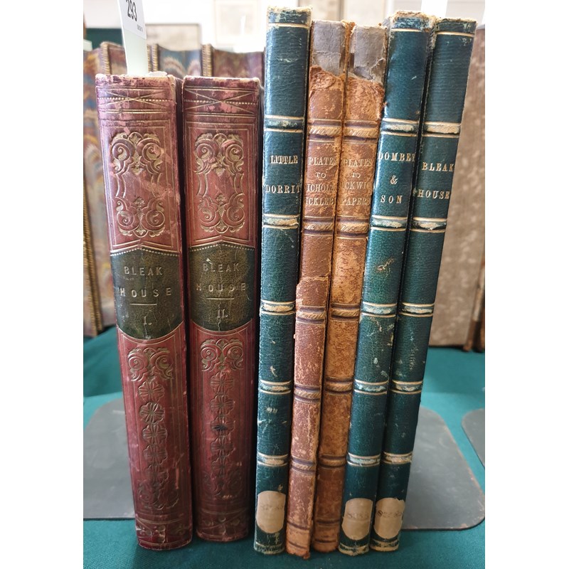 Dickens, Charles. Bleak House, 2 volumes, first edition in book form, half-title, frontispiece and additional engraved title, 37 [of 38] engraved plates after Hablot Knight Browne, lacking 'Friendly Behaviour of Mr Bucket', pp.193-4 with loss of pagination, some spotting, contemporary half calf gilt, top edge gilt, 8vo, London: Bradbury and Evans, 1853; and 5 others Dickens, being a collection of plates and advertisements from the original parts for Bleak House, Little Dorrit, Dombey & Son, Nicholas Nickleby and Pickwick Papers, 8vo (7)