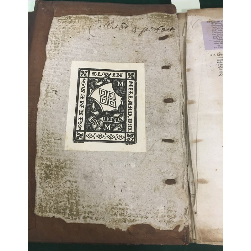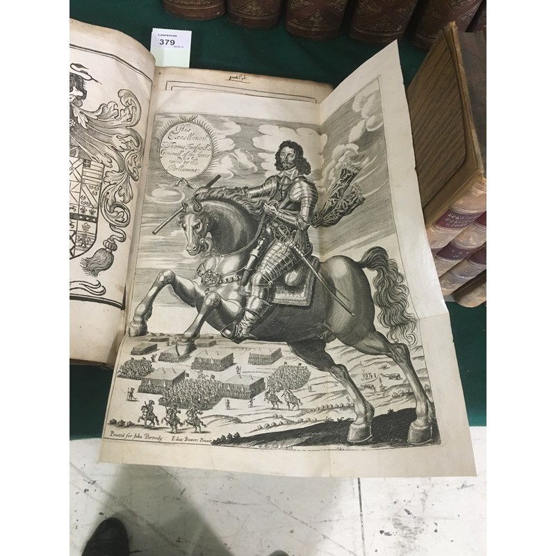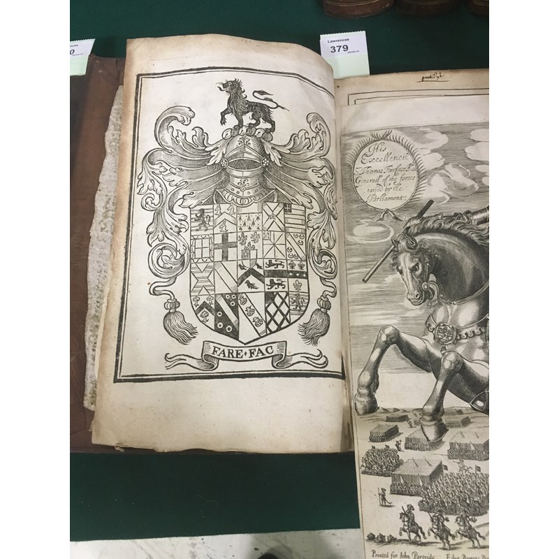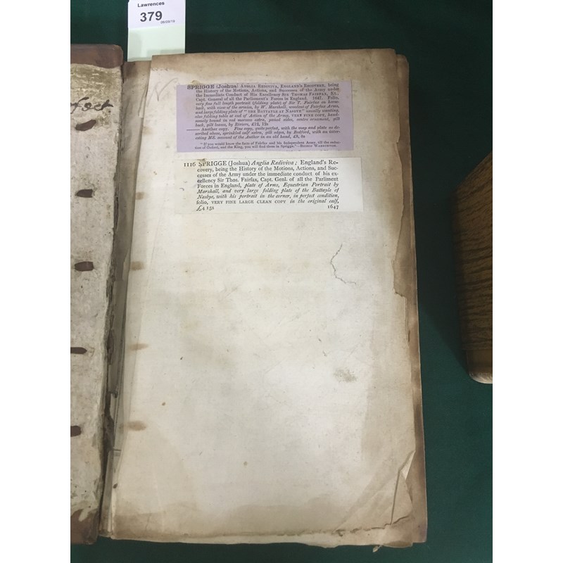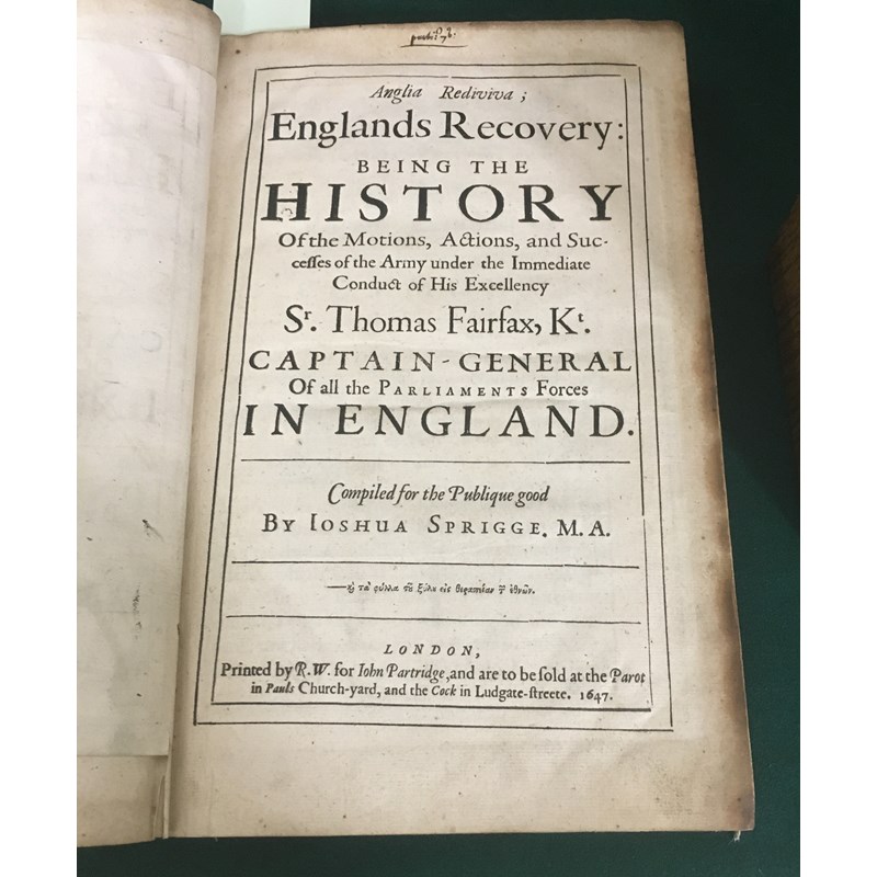 Sprigge, Joshua. Anglia Redivivia; England's Recovery: Being the History of the Motions, Actions, and Successes of the Army under the Immediate Conduct of His Excellency Sr. Thomas Fairfax, Kt., first edition, folding engraved portrait frontispiece, wood-engraved coat of arms opposite title, large folding engraved plate of the Battle of Nasbye, weakened in folds, folding table, occasional rust-marks, contemporary calf, spine chipped at foot, rubbed, bookplate of Elwin Millard, folio, London: R. W. for John Partridge, 1647 [Wing S5070]