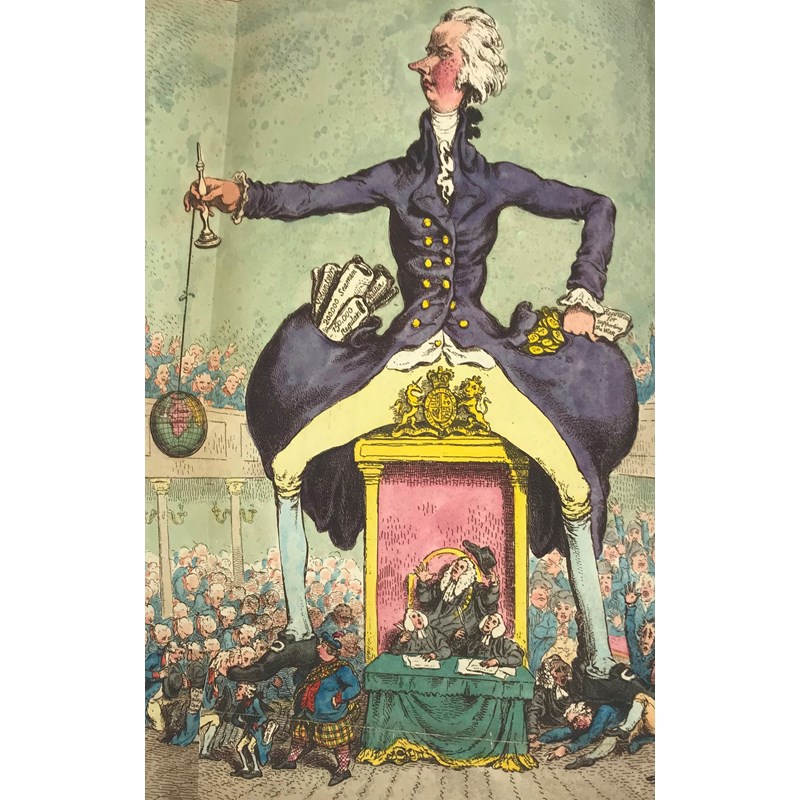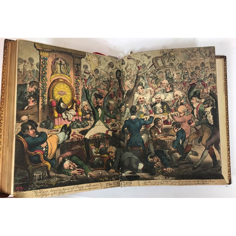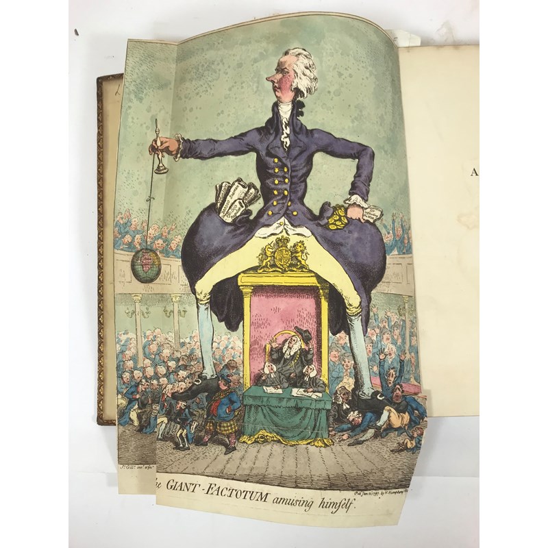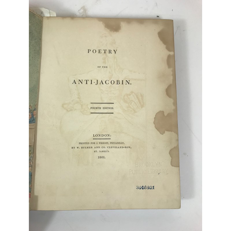 Edmonds, Charles, editor. Poetry of the Anti-Jacobin, fourth edition, half-title, EXTRA-ILLUSTRATED with 36 engraved plates, some laid to size, including 4 by James Gillray, 3 hand-coloured, early leaves heavily browned, contemporary calf by Ramage, rubbed, spine chipped with loss, ex-library copy, with usual markings, 4to, London: J. Wright, 1801