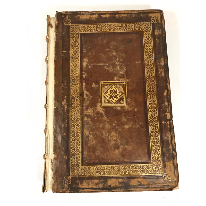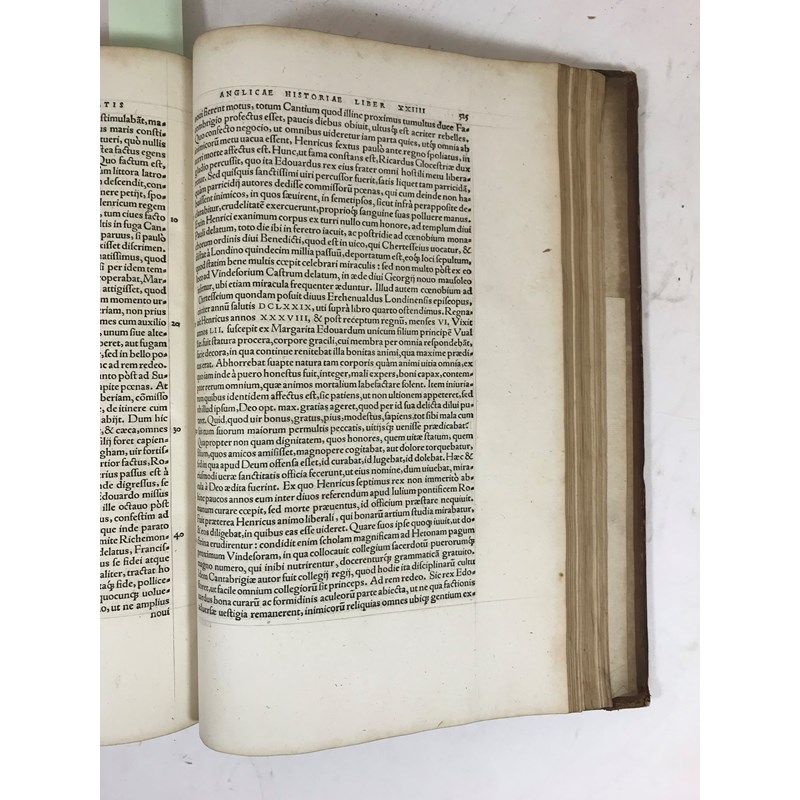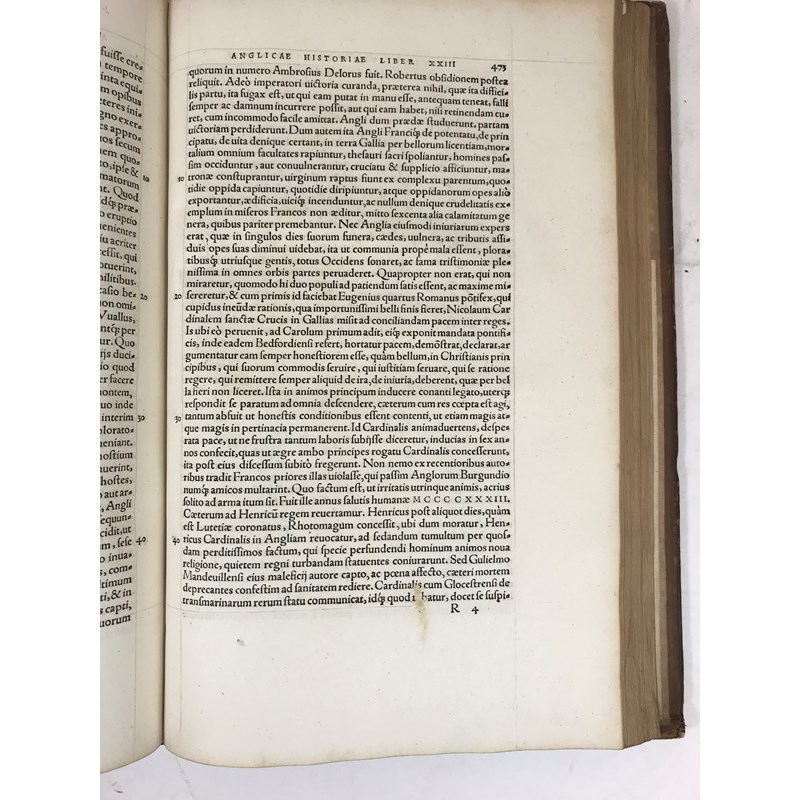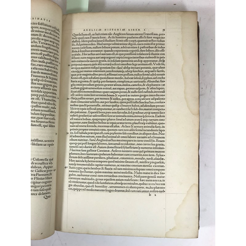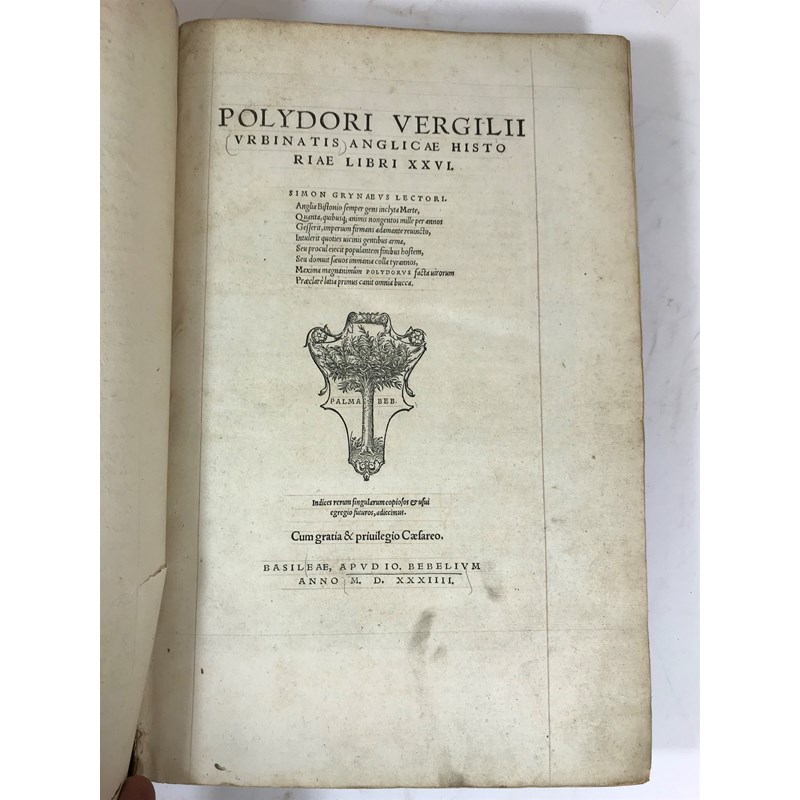 Vergil, Polydore. Anglicae historiae libri XXVI, editio princeps, wood-engraved border after Hans Holbein, red ruled borders, light staining to early leaves, R4 with slight surface loss, affecting 2 letters, minor worming to lower margins of first two signatures, eighteenth century calf gilt, worn, upper cover detached, bookplate of John, Earl of Delawarr and Elwin Millard, folio, Basel: Jo. Belebium, 1534