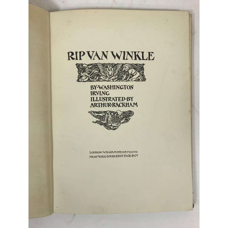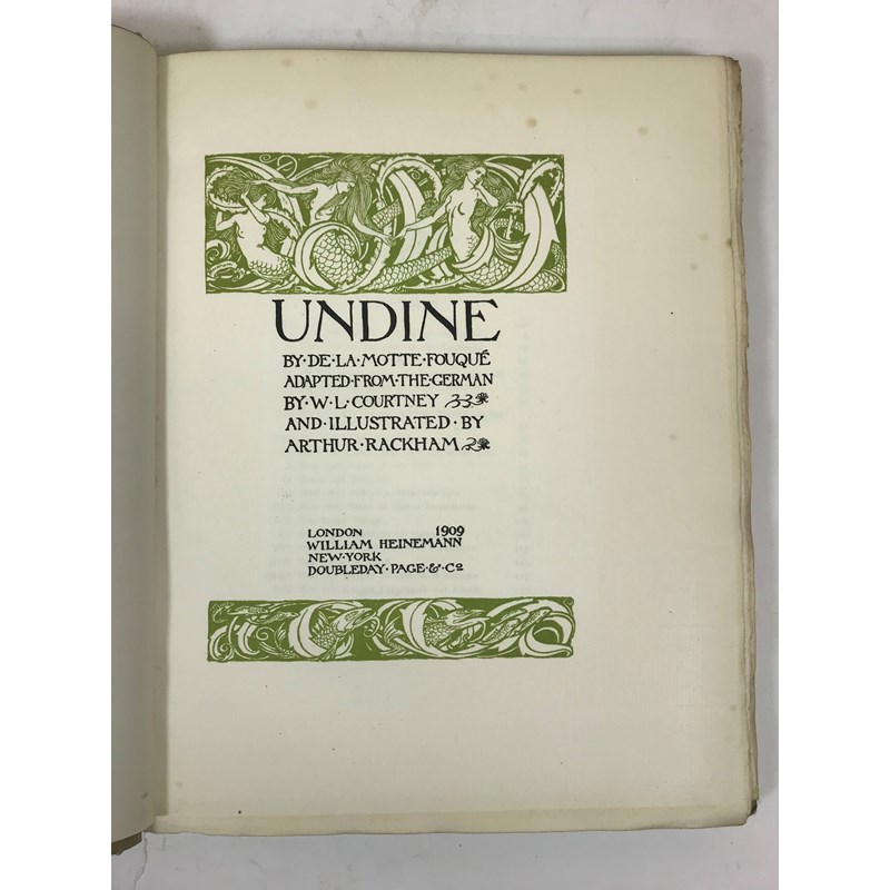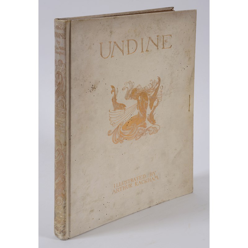 Rackham, Arthur, illustrator. Undine, by De la Motte Fouque, number 3 of 1000 copies, signed by the artist, 15 tipped-in coloured plates, tissue guards, slight spotting, original full vellum gilt, top edge gilt, others uncut, lacks ties, 4to, London: William Heinemann, 1909; Rip Van Winkle, coloured plates, original boards, spine chipped at head, 4to, London: William Heinemann, 1917 (2)