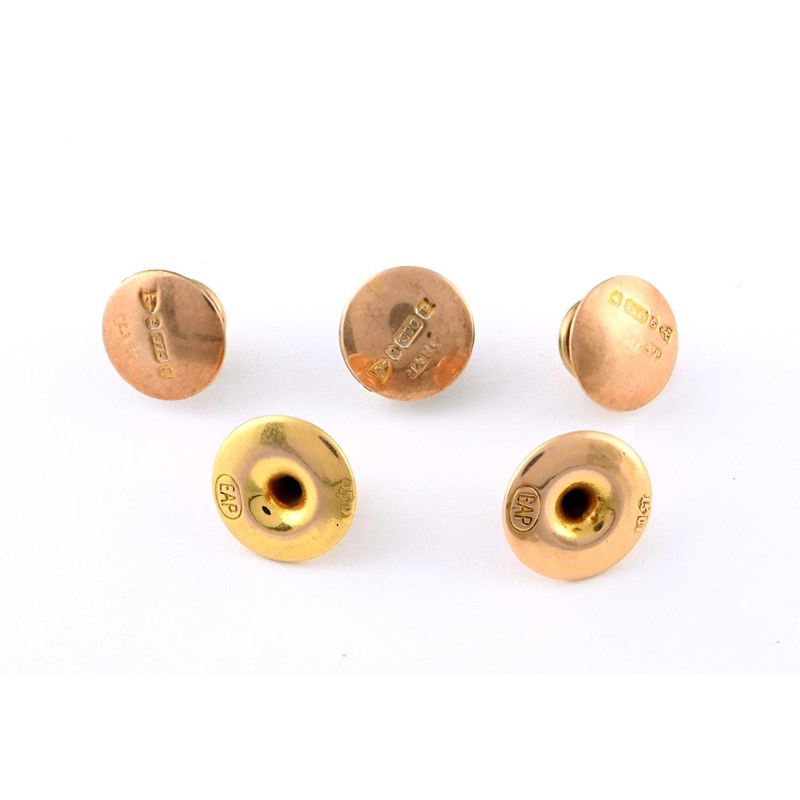 A PAIR OF 15CT GOLD DRESS BUTTONS 1.1 grams, together with three 9ct gold foliate engraved dress buttons, 1.8 grams