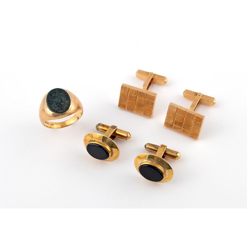 of rectangular form with engraved decoration, 12.5 grams, together with a pair of black onyx and gold cufflinks, 9.9 grams and an 18ct gold and bloodstone signet ring, engraved with a crest, size P