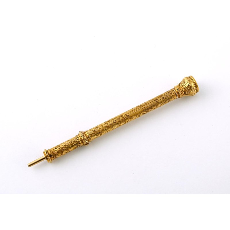 A GOLD PROPELLING PENCIL BY S. MORDAN & CO engraved overall with foliate decoration, with bloodstone endstone, 9cm long, 16 grams