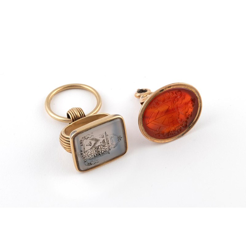 the gold scrolling body with carnelian matrix engraved with a coat of arms, 3.2cm high, together with a gold seal with chalcedony matrix, engraved with a coat of arms, 3.1cm high