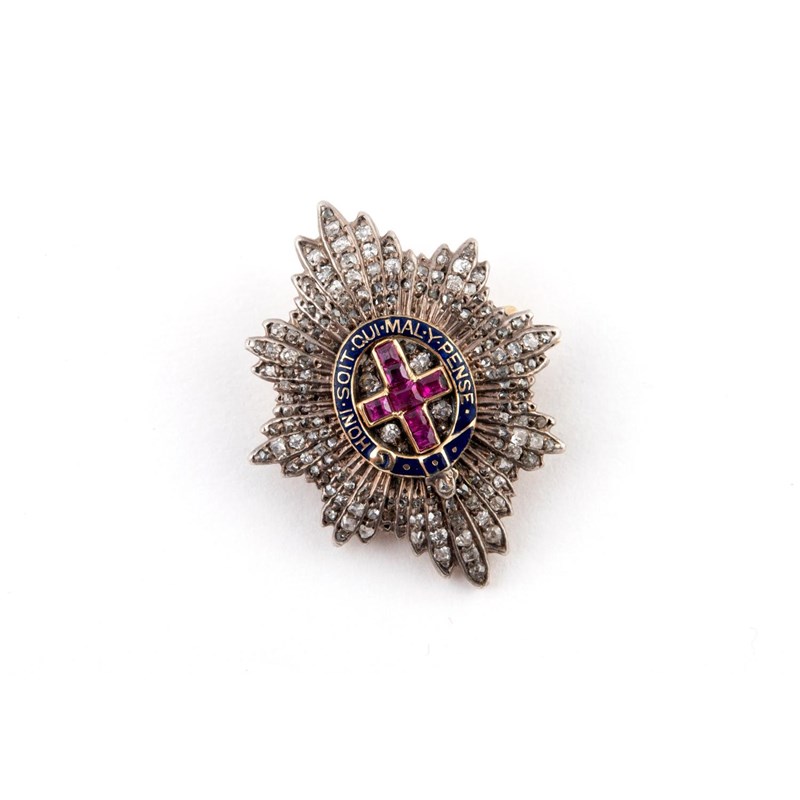 A DIAMOND, RUBY AND ENAMEL REGIMENTAL BROOCH FOR THE COLDSTREAM GUARDS set with calibre-cut rubies and set overall with rose-cut diamonds, with blue enamel decoration, in gold, 2.8cm long