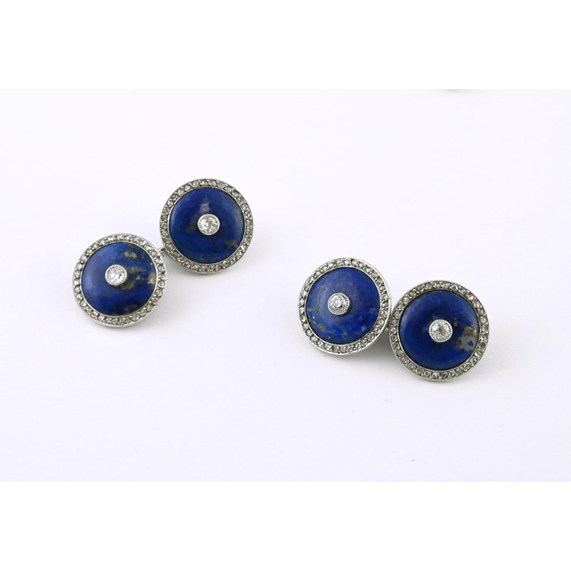 A PAIR OF LAPIS LAZULI AND DIAMOND CUFFLINKS each lapis disc is mounted with a collet set diamond within a surround of rose-cut diamonds, with French marks for platinum