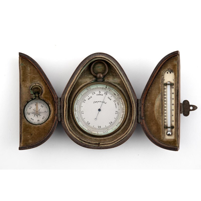 A CASED TRAVELLING SET of a metal barometer, a compass and a thermometer, the barometer 50mm dia