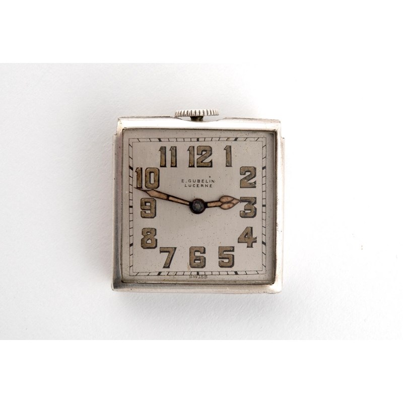 the square shaped dial signed E. Gubelin, Lucerne, with Arabic numerals, numbered to the reverse 3002052, with snake skin travelling case