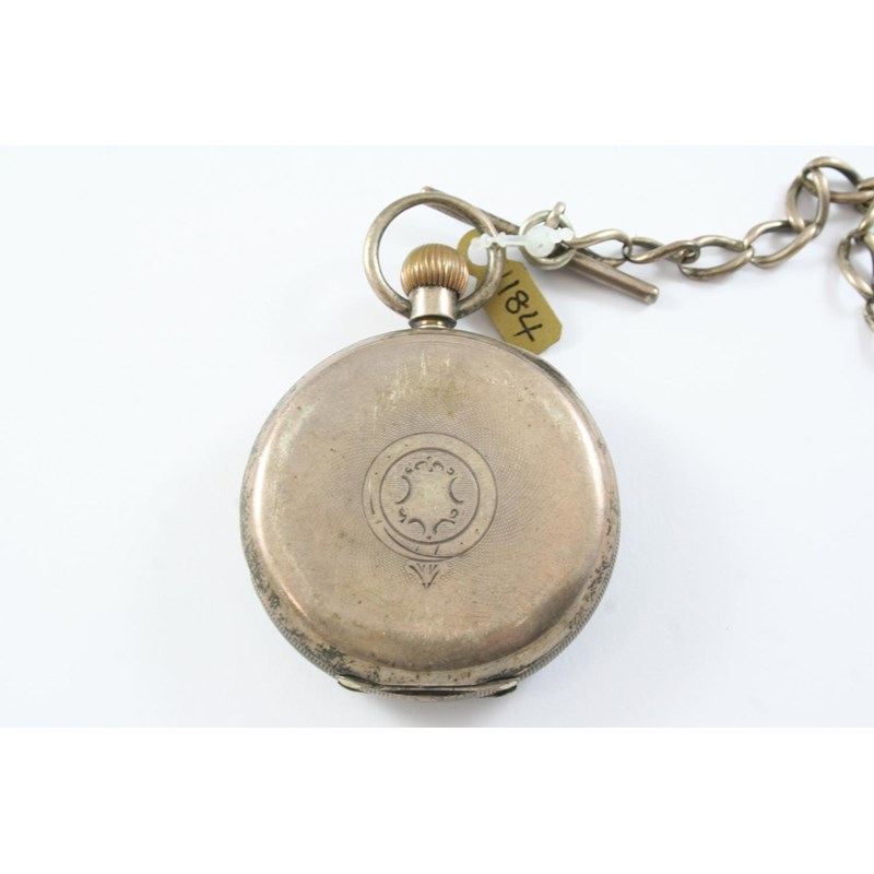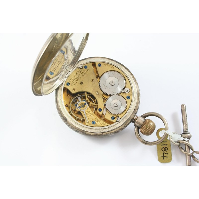 the white enamel dial with Roman numerals and subsidiary seconds dial, with engraved cartouche decoration to the back case, the movement signed American Waltham U.S.A. Traveler and numbered 13096625, 50mm dia., on a silver oval link watch chain