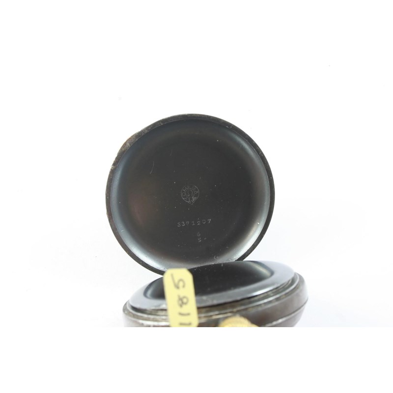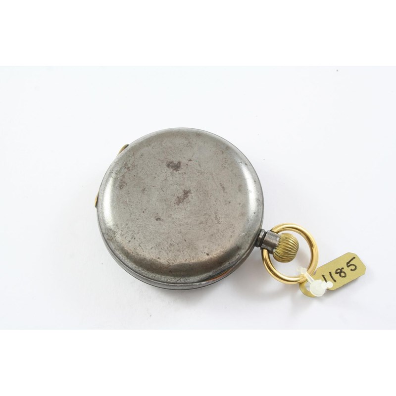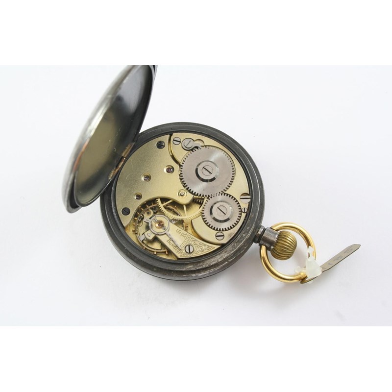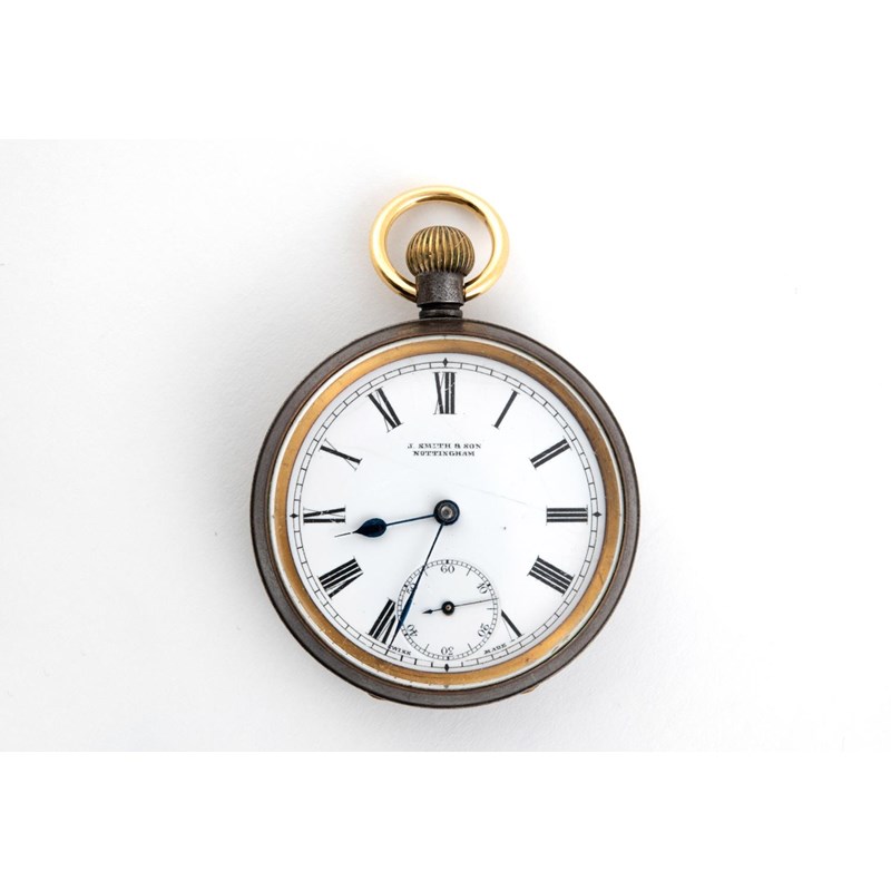 A GUNMETAL OPEN FACED POCKET WATCH the white enamel dial signed J. Smith & Son, Nottingham, with Roman numerals and subsidiary seconds dial, the inner case signed Omega and numbered 3371207, 48mm dia
