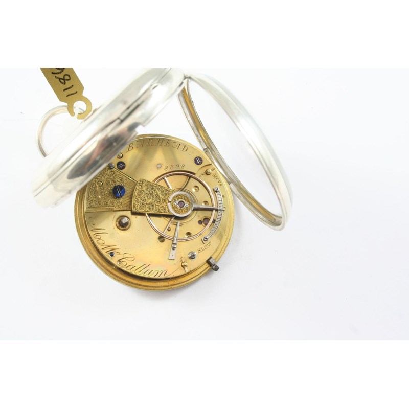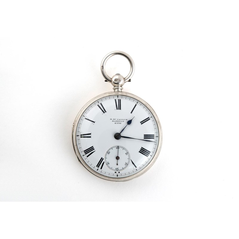 A SILVER OPEN FACED POCKET WATCH BY M. Mc.CALLUM, BARHEAD the signed white enamel dial with Roman numerals and subsidiary seconds dial, hallmarked for London 1864, 50mm dia