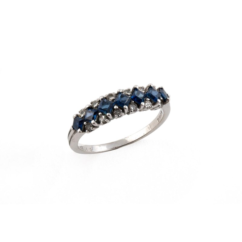 A SAPPHIRE AND DIAMOND HALF HOOP RING the seven square-shaped sapphires are set with single-cut diamonds in 18ct white gold. Size O 1/2