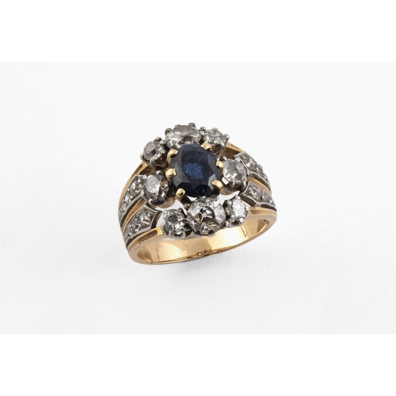 A SAPPHIRE AND DIAMOND CLUSTER RING the oval-shaped sapphire is set within a surround of cushion-shaped and rose-cut diamonds, in gold. Size M