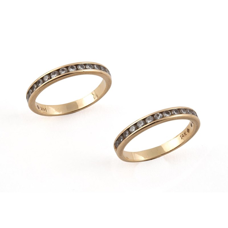 A PAIR OF DIAMOND AND GOLD HALF HOOP RINGS each set with fifteen circular-cut diamonds in 14ct gold. Size P 1/2