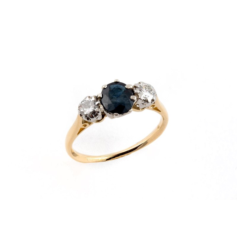 A SAPPHIRE AND DIAMOND THREE STONE RING the circular-cut sapphire is set with two circular-cut diamonds, in yellow gold. Size I 1/2