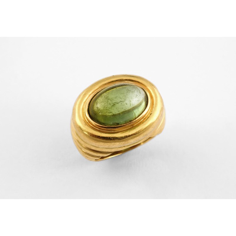 A TOURMALINE AND GOLD RING the oval-shaped cabochon green tourmaline mounted in 18ct gold ridged setting. Size J 1/2