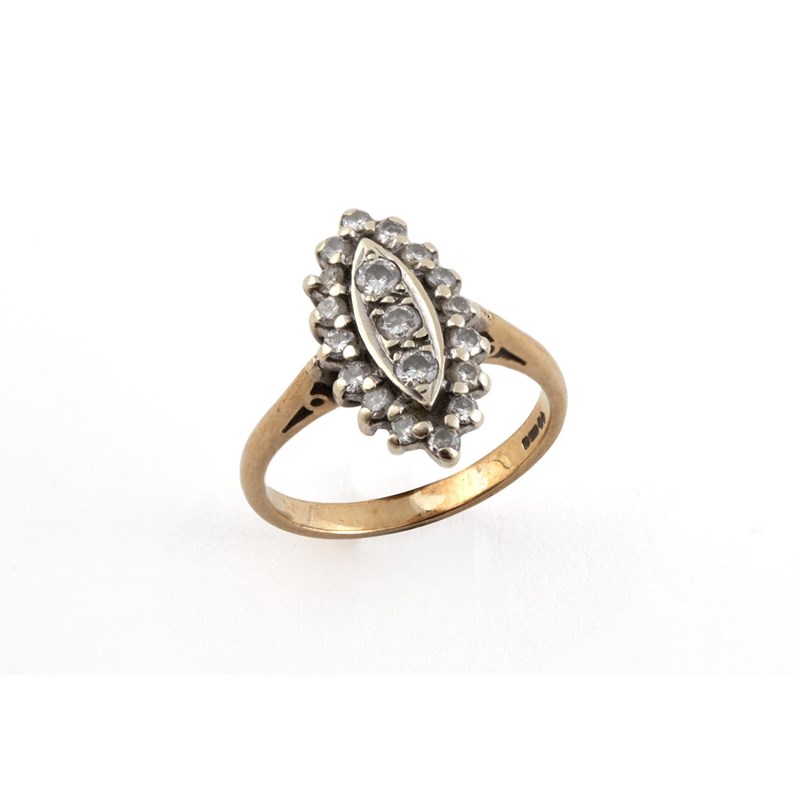 A DIAMOND MARQUISE-SHAPED CLUSTER RING centred with three circular-cut diamonds within a surround of smaller circular-cut diamonds, in gold. Size L