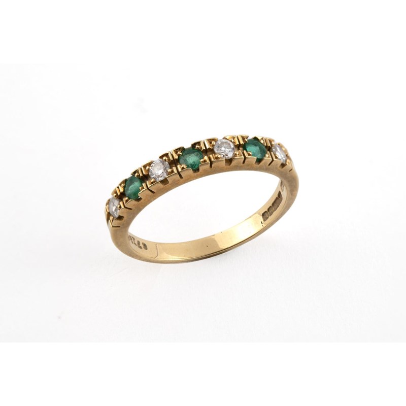 AN EMERALD AND DIAMOND HALF HOOP RING the three circular-cut emeralds are set with four circular-cut diamonds, in 18ct yellow gold. Size P 1/2
