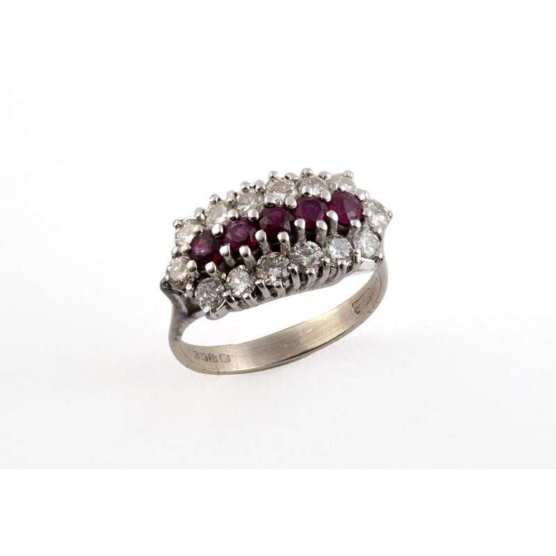 A RUBY AND DIAMOND CLUSTER RING the five circular-cut rubies are set within a surround of circular-cut diamonds in 18ct white gold. Size N 1/2