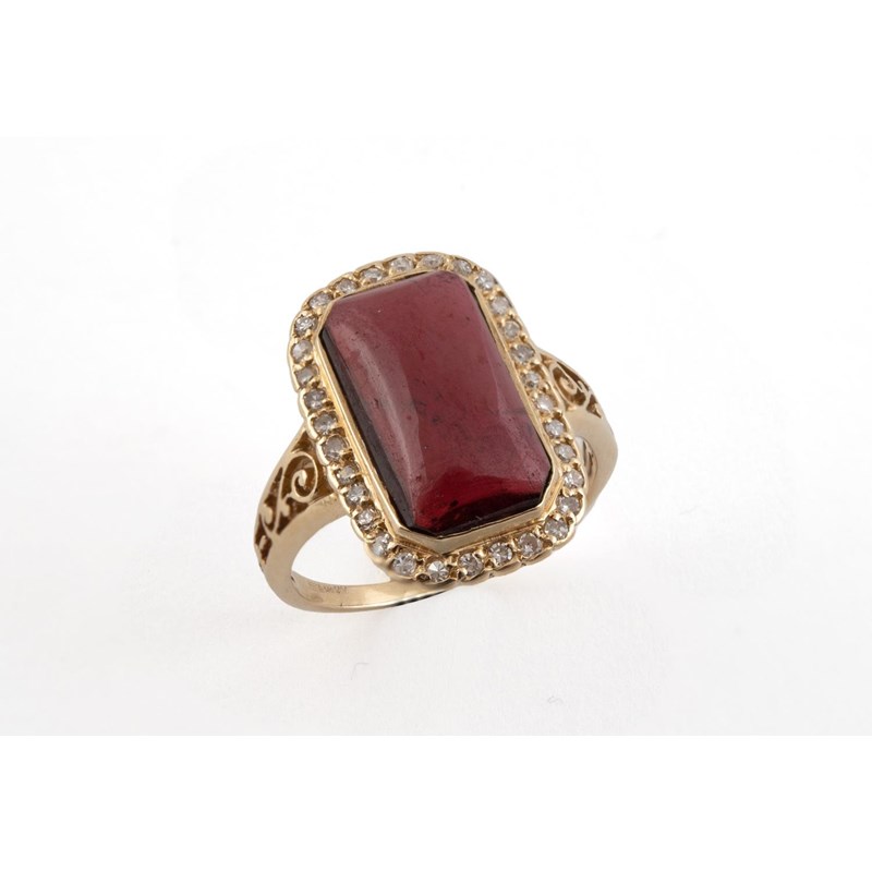 A GARNET AND DIAMOND CLUSTER RING the rectangular-shaped cabochon garnet is set within a surround of circular-cut diamonds in 15ct gold. Size O 1/2
