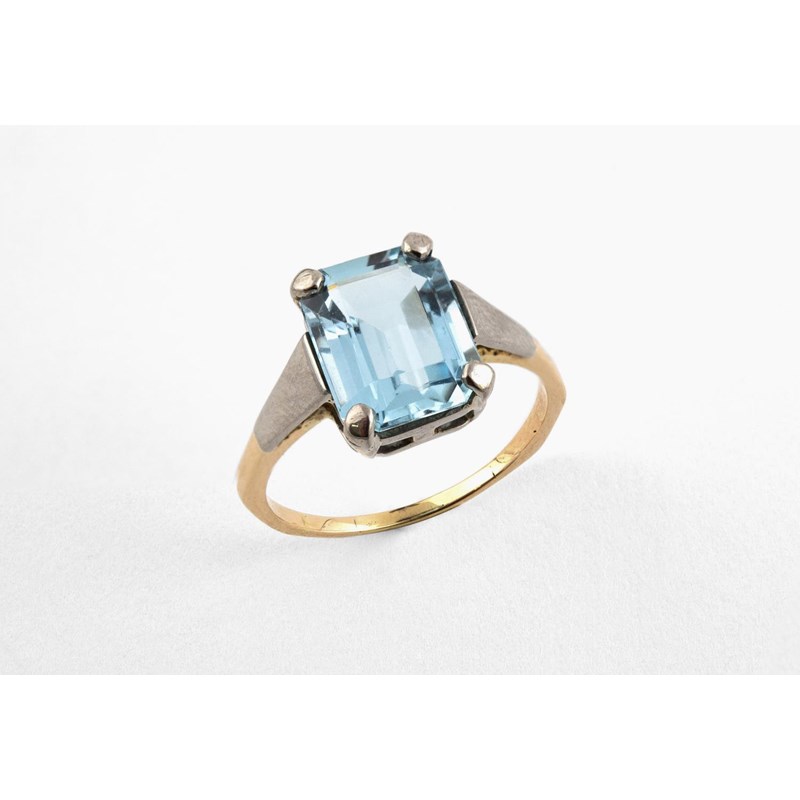 AN AQUAMARINE SINGLE STONE RING the step-cut aquamarine is set in gold. Size O 1/2