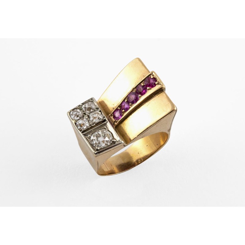 mounted with cushion-shaped old-cut diamonds, and circular-cut rubies, in gold, with French marks to the shank, including the eagle's head for 18ct gold. Size M 1/2. Circa 1940