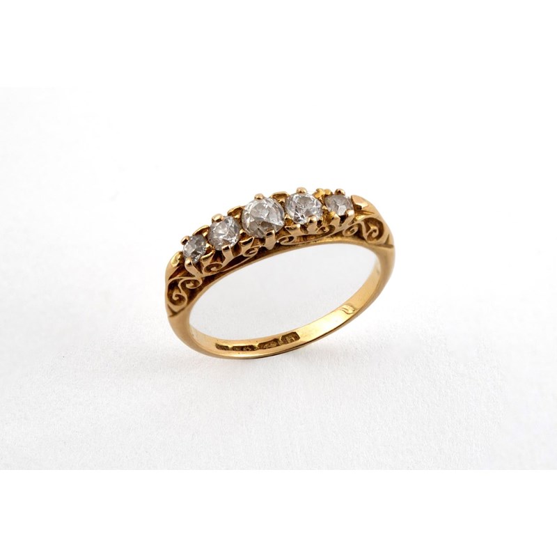 A DIAMOND FIVE STONE RING set with five graduated round old-cut diamonds, in 18ct yellow gold. Size I 1/2