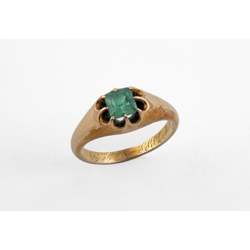 the square-shaped emerald is set in yellow gold, with inscription to the inner shank dated for July 1888. Size K 1/2