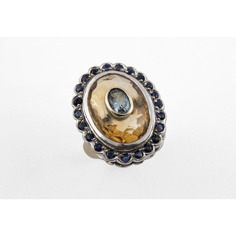 AN AQUAMARINE, CITRINE AND SAPPHIRE CLUSTER RING the oval-shaped citrine is mounted with an oval-shaped aquamarine within a surround of circular-cut sapphires, in 9ct gold. Size K