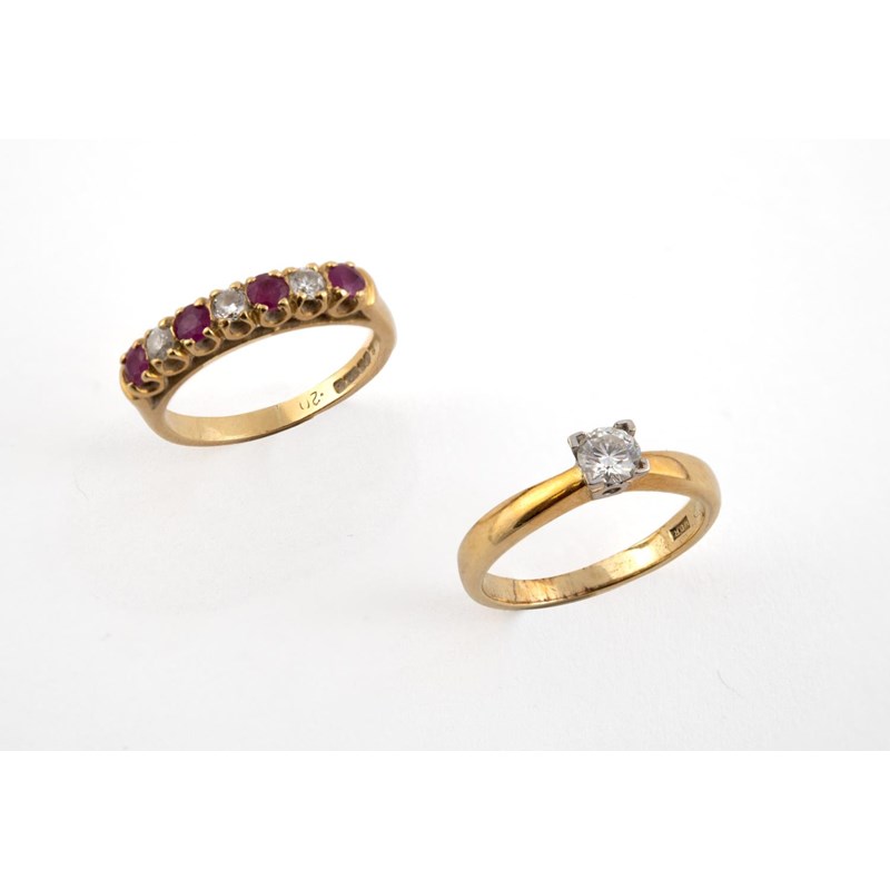 the brilliant-cut diamond is set in 18ct gold, size K 1/2, together with a ruby and diamond half hoop ring, the four circular-cut rubies are set with three circular-cut diamonds, in 18ct gold, size K
