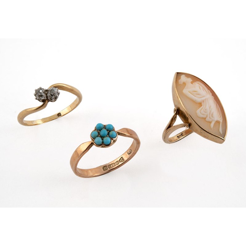 set with two rose-cut diamonds, in yellow gold, size P, together with a turquoise cluster ring, set in 9ct yellow gold, size Q and a oval-shaped carved cameo ring, set in 9ct gold, size L