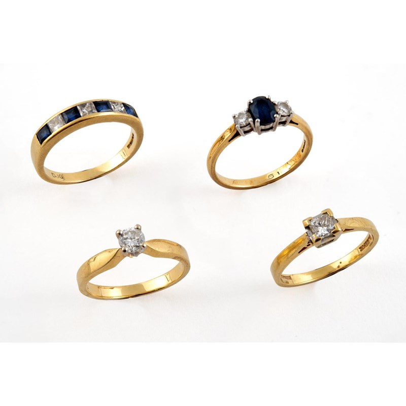 the square-shaped diamond is set in 18ct yellow gold, size N, together with a diamond solitaire ring, the circular-cut diamond is set in 18ct yellow gold, size M, a sapphire and diamond three stone ring, the oval-shaped sapphire is set with two circular-cut diamonds in 18ct yellow gold, size M 1/2, a sapphire and diamond half hoop ring, set alternately with square-shaped sapphires and diamonds, in 18ct yellow gold, size M