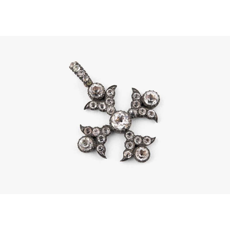 A 19TH CENTURY PASTE AND GOLD CRUCIFORM PENDANT mounted with circular white paste stones, in gold closed back settings, 4.5 x 3.5cm