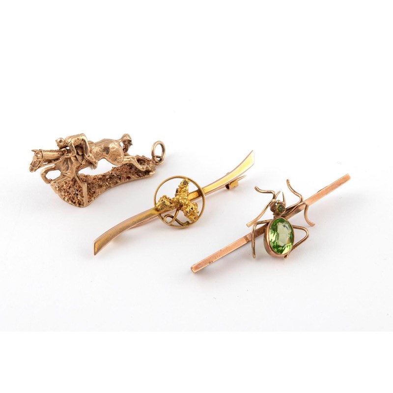 depicting a horse and jockey jumping a fence, 4cm long, 12.9 grams, together with a peridot and 9ct gold spider brooch, 6cm long, 3.6 grams and a gold foliate brooch, 6cm long, 5.1 grams