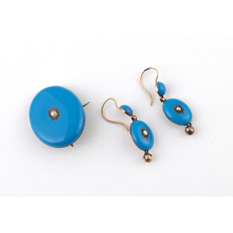 the oval shaped mount with turquoise enamel centred with a small pearl, in gold, with locket compartment to the reverse containing hair, 2.7cm wide, together with a pair of drop earrings, 3cm long