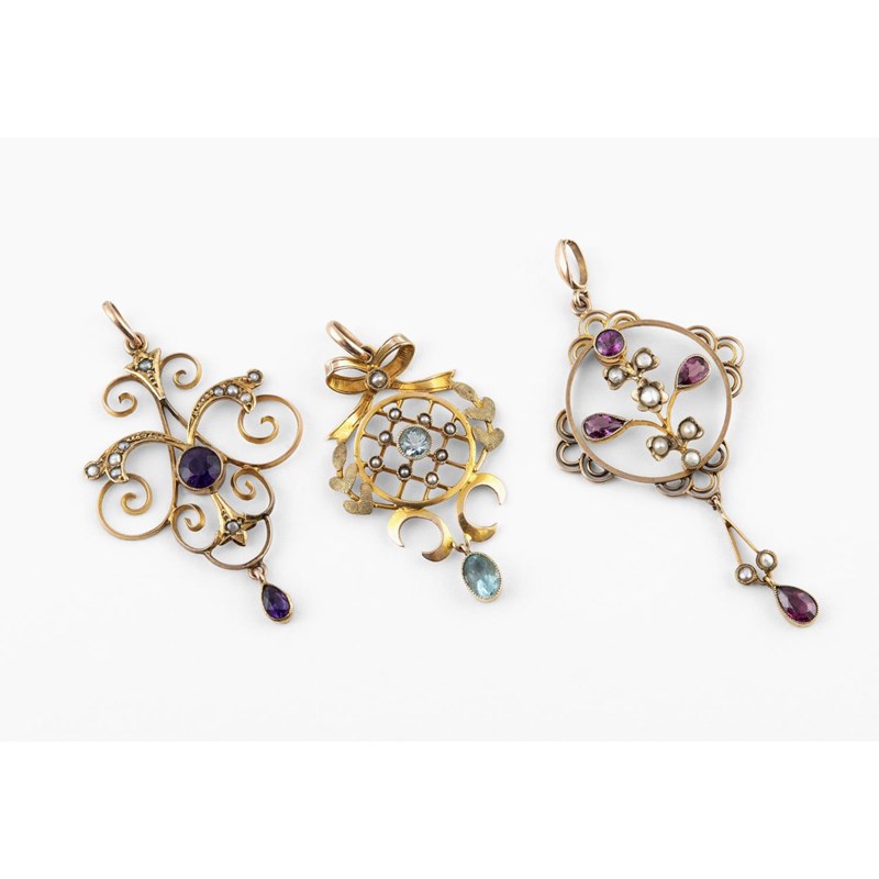 the 9ct gold lattice work mount set with a circular-cut aquamarine surrounded by small pearls, suspending an aquamarine drop, 4cm long, together with an amethyst and seed pearl pendant, set in a 9ct gold openwork mount, 5cm long and a garnet and seed pearl pendant, set in a 9ct gold foliate mount, 6cm long