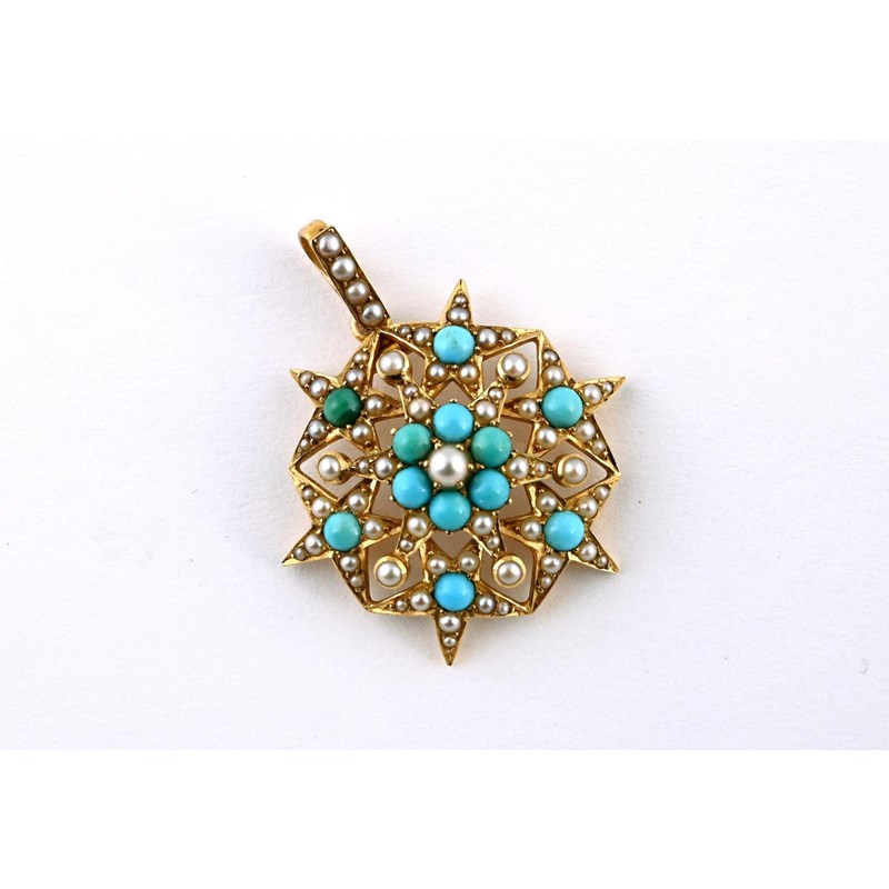 A GOLD, TURQUOISE AND PEARL STAR BROOCH PENDANT