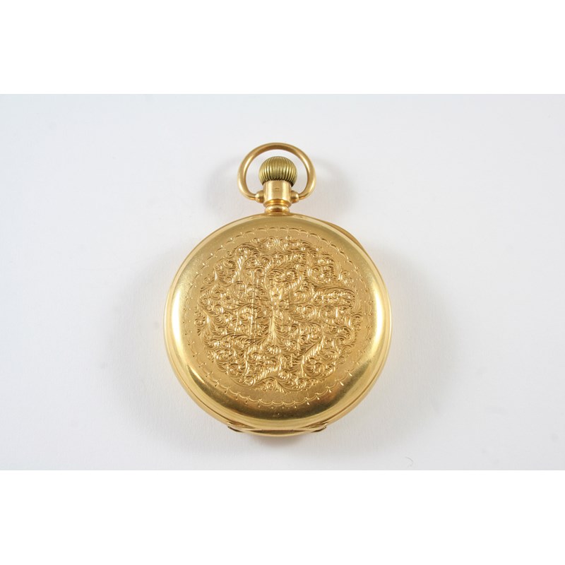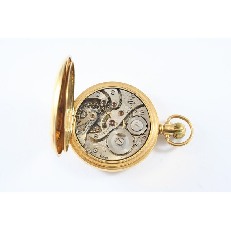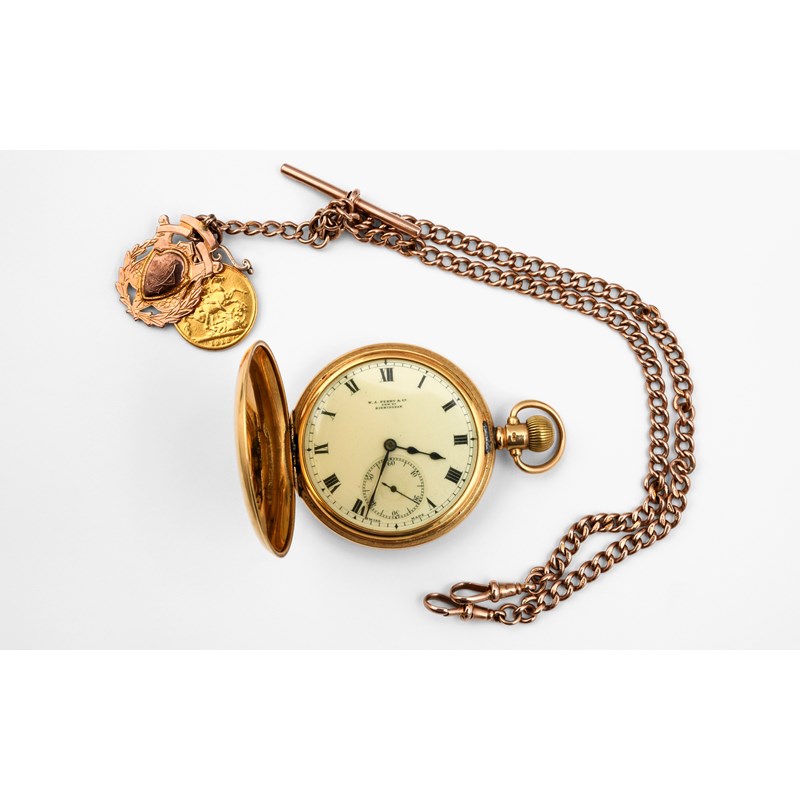 AN 18CT GOLD FULL HUNTING CASED POCKET WATCH BY W.A. PERRY & CO., NEW ST, BIRMINGHAM the signed circular dial with Roman numerals and subsidiary seconds dial, the case numbered 8833998, hallmarked for Birmingham 1916, with foliate engraved decoration to both cases, 50mm dia., 99.9 grams, together with a 9ct rose gold curb link watch chain, suspending a 9ct gold 't' bar, a 9ct gold medallion, and a gold sovereign 1913, attached to a pendant fitting, 41cm long, total weight of watch chain and attachments 41.6 grams