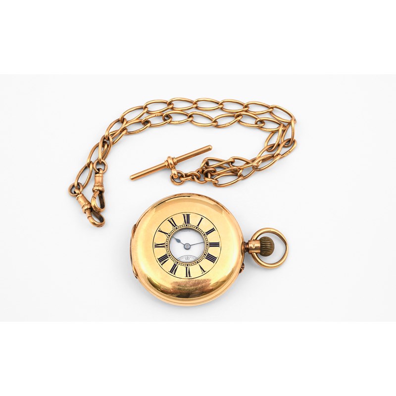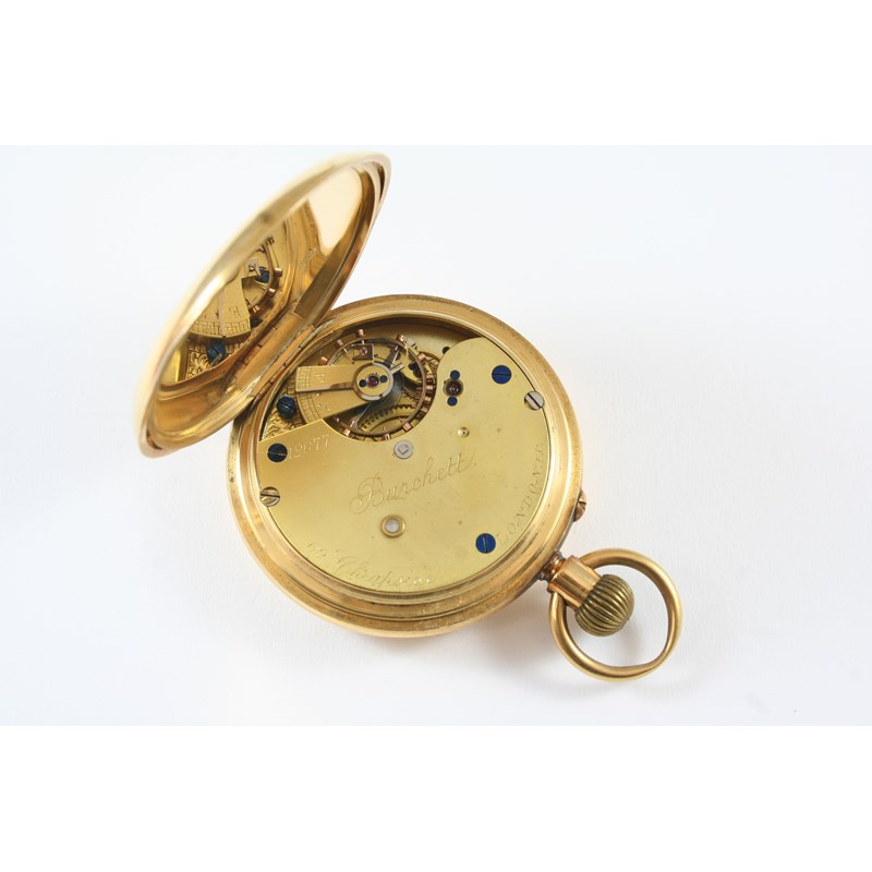 the white enamel dial signed Burchett, 69 Cheapside, with black Roman numerals and subsidiary seconds dial, numbered 12677 to the inner case, hallmarked for London 1888, three quarter plate movement, 48mm dia., 99.6 grams, together with an 18ct gold oval link watch chain, each link stamped for 18ct., suspending an 18ct gold 't' bar, 34.5cm long, 29.3 grams