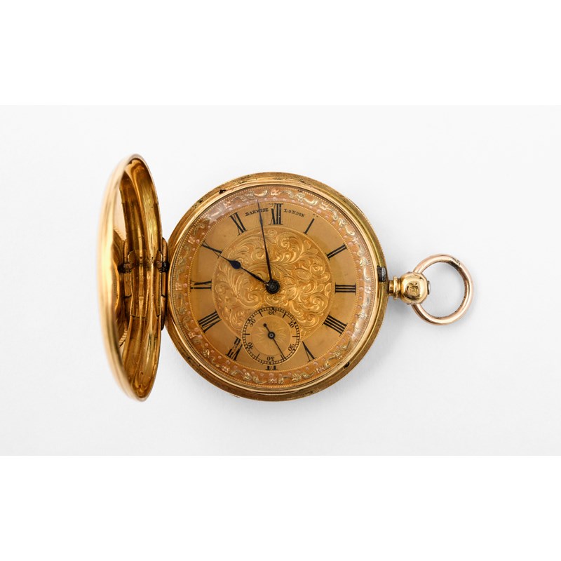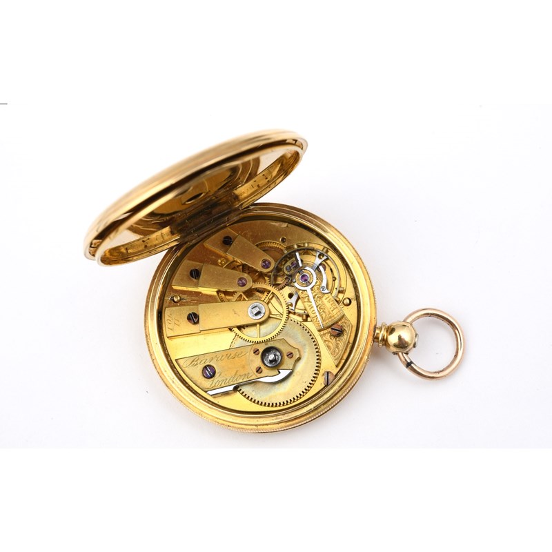 the gold foliate dial signed Barwise, London, with black Roman numerals and subsidiary seconds dial, duplex escapement, with engine turned decoration to both cases, 40mm dia., 54.9 grams