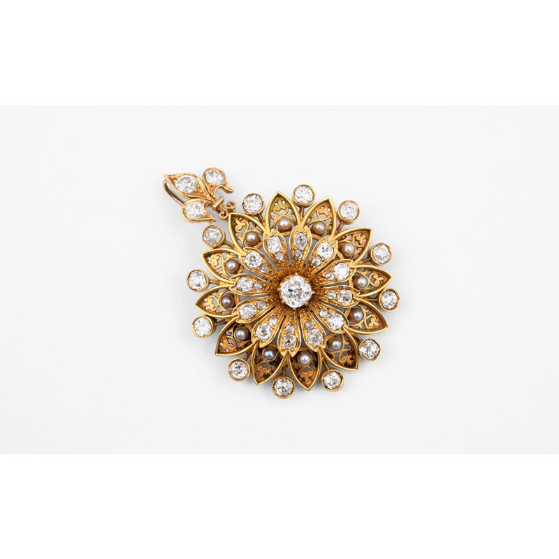 of flowerhead form, mounted overall with graduated old-cut and rose-cut diamonds, with small half pearls in a gold openwork mount, with further diamonds set to the fleur-de-lys surmount, 4cm dia