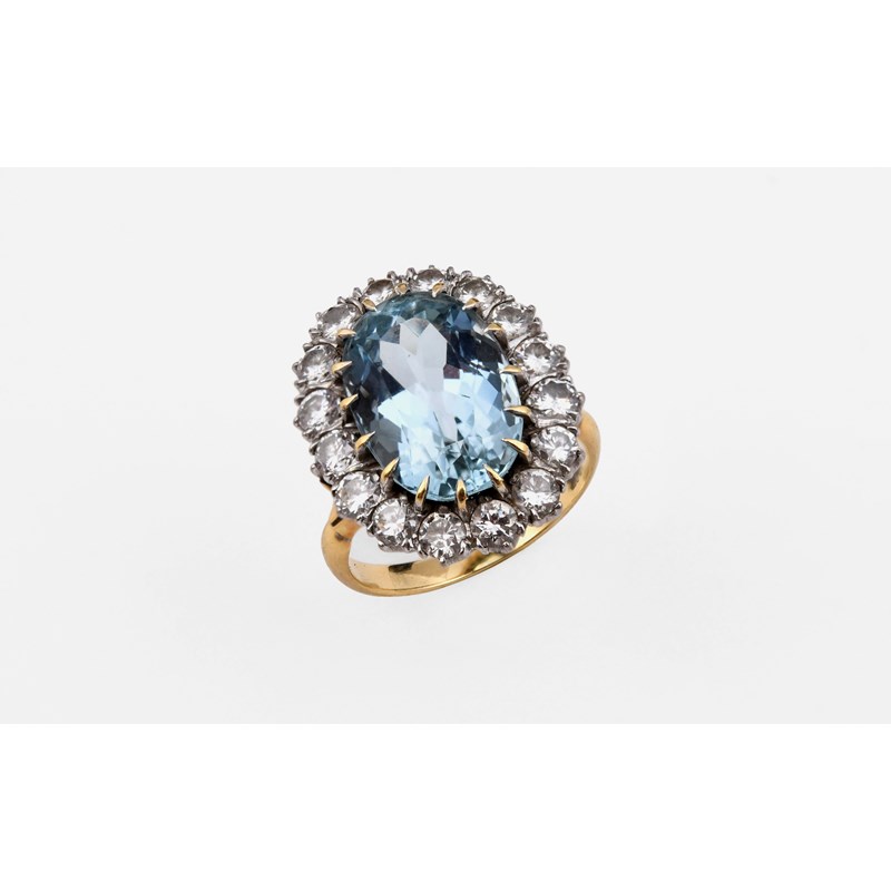 AN AQUAMARINE AND DIAMOND CLUSTER RING the oval-shaped aquamarine is set within a border of sixteen circular-cut diamonds in 18ct gold. Size N