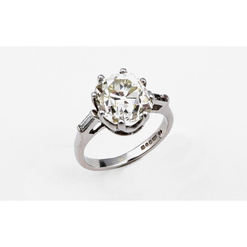 A DIAMOND SOLITAIRE RING the old cushion-shaped diamond weighs approximately 4.60 carats and is set with a baguette-cut diamond to one shoulder, one shoulder diamond is missing, in platinum. Size J 1/2