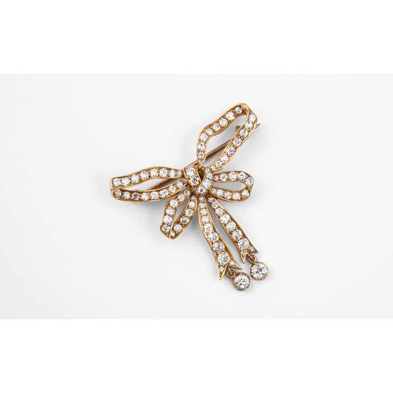the tied ribbon design is set overall with graduated circular-cut diamonds and suspends two diamond drops, in 18ct yellow gold, 5cm wide