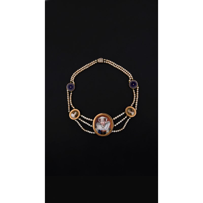 the pearl necklace mounted with two gold discs with enamel decoration and three portrait miniatures, mounted in gold frames, depicting: