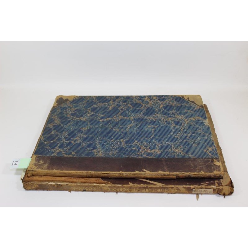 Cotman, John Sell. Etchings, first edition, engraved title, dedication and 24 engraved plates, browned and spotted, 4pp. list of subscribers, 2pp. descriptive index, inscribed 'Thomas Boys', contemporary half morocco, worn, folio, Edinburgh: Boydell & Co., 1811; [Specimens of Norman and Gothic Architecture in the County of Norfolk], 51 engraved plates only, lacks title and text, publisher's boards, label, worn, folio, [London: Longman & Co., 1818] (2)